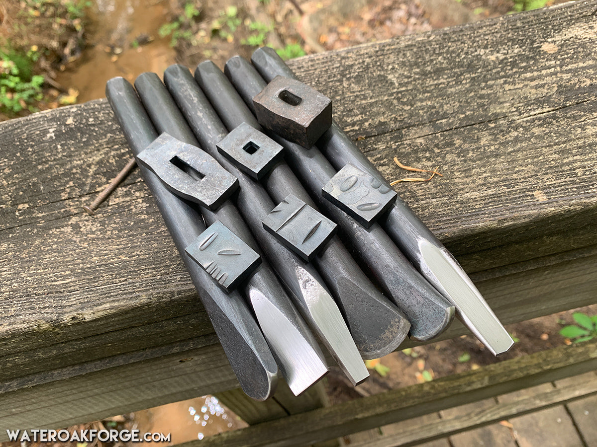 An assortment of some of the most commonly used punches, chisels and fullers in one set. Made from 5/8" diameter O1 Tool steel and are approx. 7.25" inches in length. These tools are meant to be used on hot steel only.