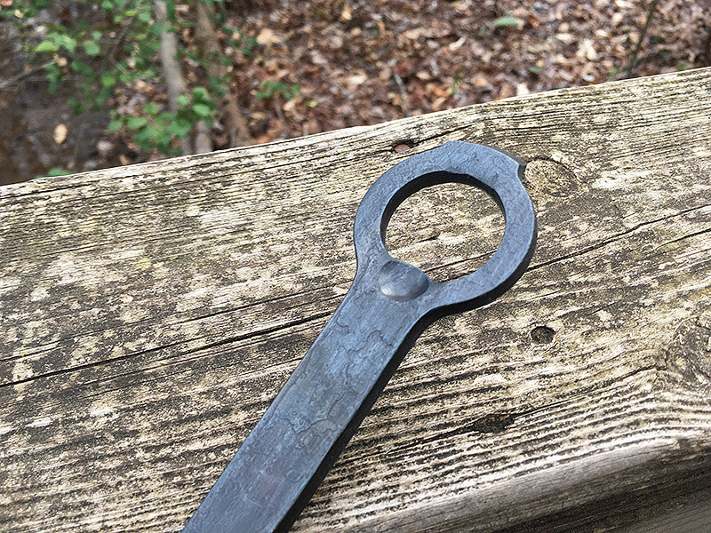 Hand forged steak turner with a bottle opener handle. Made from a mild carbon steel, so wipe down with a light coat of vegetable oil after cleaning.